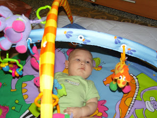 Ethan has also started whacking the sofa, bed, his parents or whatever is in his reach with his left and right arm. Adam and I are expecting bruises on our limbs any day now. HeeHee. (He sure slaps hard!)